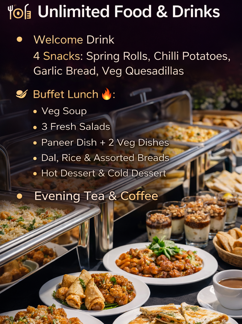 From welcome drinks to snacks, a full buffet lunch, desserts, tea & coffee and games — everything is included.