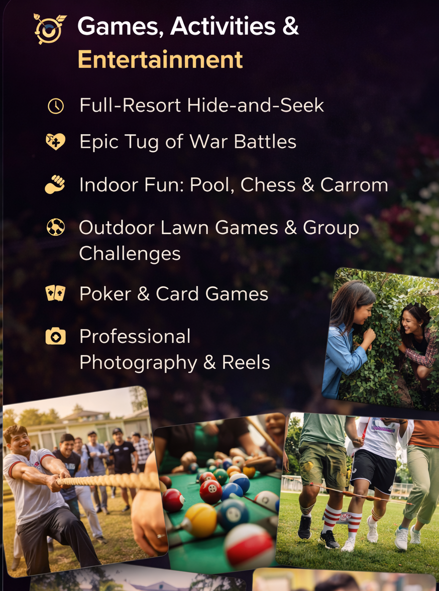 Hide-and-seek across the entire resort, tug of war, indoor games like pool, chess & carrom, plus outdoor lawn games and group challenges — nonstop fun that keeps the energy high all day.