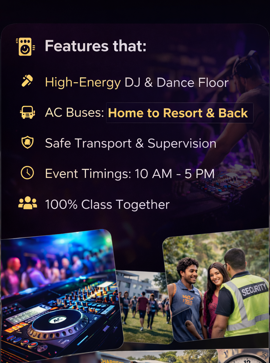 A full-day luxury resort experience packed with unlimited food, high-energy DJ beats, crazy games, premium facilities, safe transport from home and memories you’ll talk about for years.